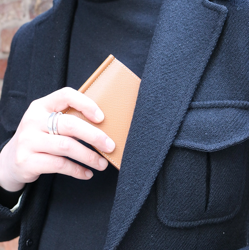 ジャケットの内ポケットに財布を入れた際、シルエットが崩れるのを嫌う紳士たちが、薄くてかさばらない「身だしなみの道具」として愛用しました。