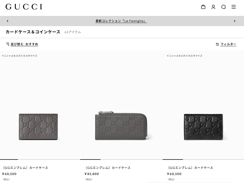 1921年創業のイタリアを代表するラグジュアリーブランドで、クラフトマンシップと華やかなデザイン性で知られています。名刺入れもGGパターンやシグネチャーを取り入れた存在感のあるものから、落ち着いたレザーを使った上品なタイプまで幅広いラインナップが魅力。