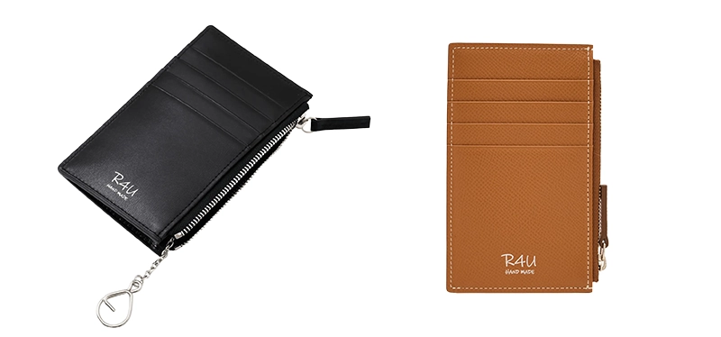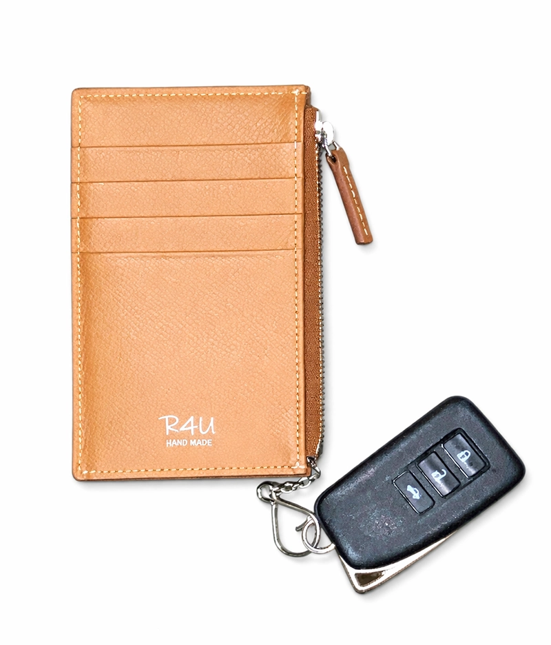カード4枚、ファスナーポケット1つ、キーチェーンを備え、カード・小銭・鍵などの小物をコンパクトに整理できます。